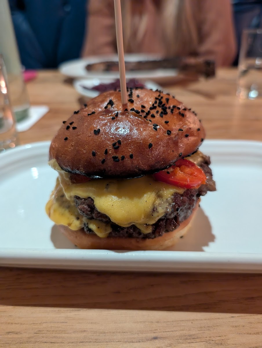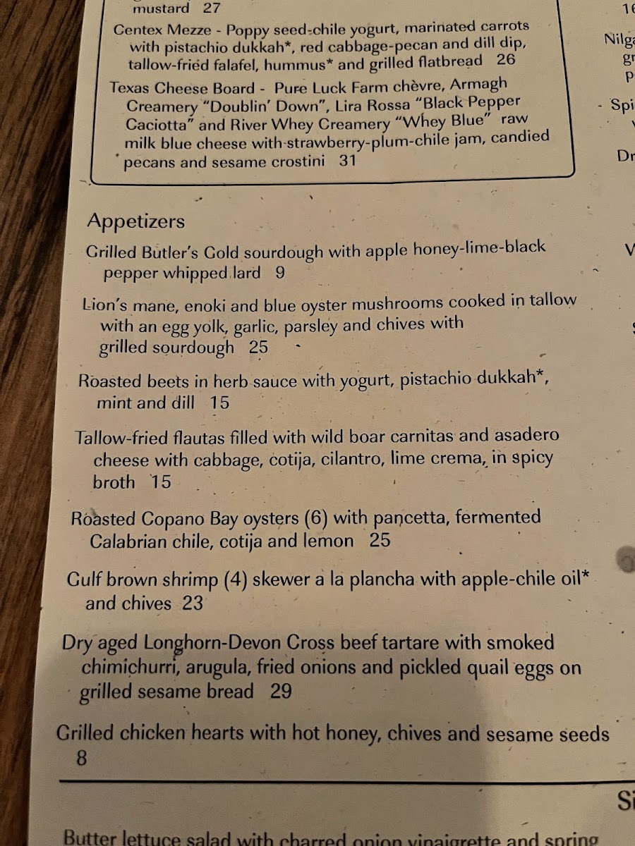 One of the highlights of Dai Due's menu is the Wild Game Dirty Rice Hand Pie, a delightful appetizer that's not just comfort food but an exciting culinary journey, bursting with rich flavors for just $11.00. The Dry-aged Nilgai Antelope Tartare at $28.00 is a must-try, elegantly prepared with pickled blueberries and ginger mayonnaise, showcasing the restaurant's focus on unique and high-quality ingredients.