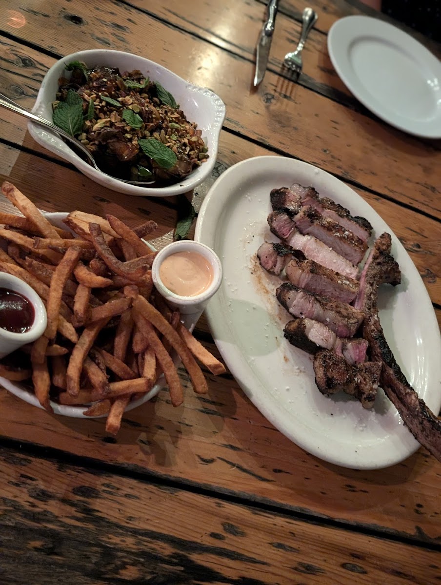 For a standout main course, indulge in the Smoked Pork Porterhouse Chop paired with sauerkraut and Bavarian mustard for a hearty $51.00, or opt for an exquisite Dry-Aged Wagyu Ribeye, priced at $98.00, a sublime experience that melts in your mouth and highlights the restaurant's dedication to premium meat.
